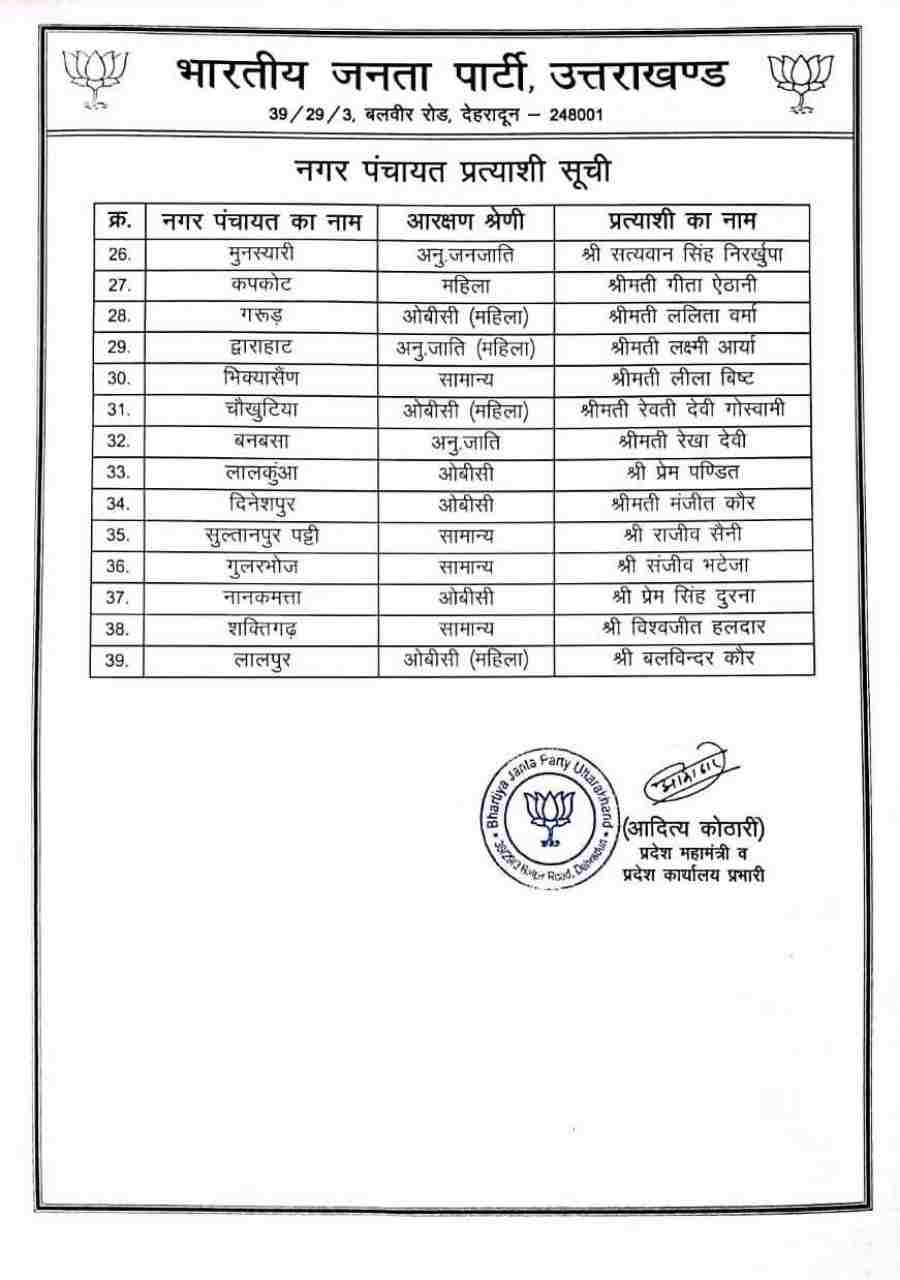 उत्तराखंड बीजेपी ने निकाय चुनाव के लिए नगर पालिका और नगर पंचायतों के अध्यक्ष पद के लिए उम्मीदवारों का ऐलान कर दिया है।