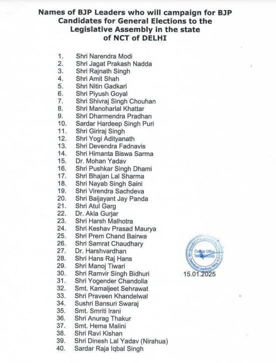 दिल्ली चुनाव के लिये भाजपा ने जारी की स्टारप्रचारकों की लिस्ट