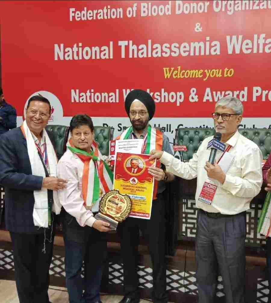 (01अक्टूबर 2024) के अवसर पर “फेडरेशन ऑफ ब्लड डोनर आर्गेनाइजेशनंस ऑफ इण्डिया” एवं “नेशनल थैलीसीमिया वेलफेयर सोसायटी , नई दिल्ली” द्वारा कांस्टीट्यूशन क्लब ऑफ इण्डिया, नई दिल्ली के डिप्टी स्पीकर हाॅल में आयोजित नेशनल वर्कशॉप एवं अवार्ड प्रेजेंटेशन सेरेमनी के दौरान एक बार पुनः चुनकर पूर्व सेक्रेटरी जनरल राज्य सभा व राज्यपाल उत्तराखंड एवं सिक्किम “सुदर्शन अग्रवाल मेमोरियल अवॉर्ड” से राष्ट्रीय स्तर पर अलंकृत किया गया।