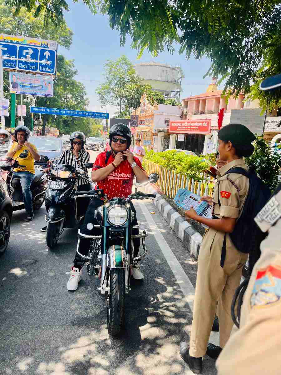 यातायात के बढते दबाव के बीच बेहतर यातायात प्रबन्धन हेतु एसएसपी दून द्वारा स्वंय ग्राउण्ड जीरो पर रहते हुए लगातार सकारात्मक कदम उठाये जा रहे हैं। इसी क्रम में लोेेगों को यातायात के नियमों का पालन करने हेतु प्रेरित करने तथा इसमें सामाजिक सहभागिता को बढावा देने के उद्देश्य से एक नई पहल की शुरूवात करते हुए पुलिस द्वारा *“सड़क सुरक्षा में समाज की साझेदारी”* थीम पर आज दिनांक: 25-07-25 को सामाजिक संस्था अरदास समाज कल्याण (ASK) ट्रस्ट के साथ मिलकर जनपद देहरादून में अलग-अलग स्थानों पर जागरूकता अभियान चलाया गया। अभियान के दौरान यातायात पुलिस, देहरादून तथा ASK ट्रस्ट द्वारा दिलाराम चौक, सर्वे चौक, लालपुल, बल्लूपुर, सहारनपुर चौक एवं रिस्पना पुल जैसे प्रमुख स्थानों पर यात्रियों और राहगीरों को यातायात नियमों के पालन करने हेतु जागरूक किया गया।